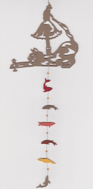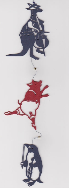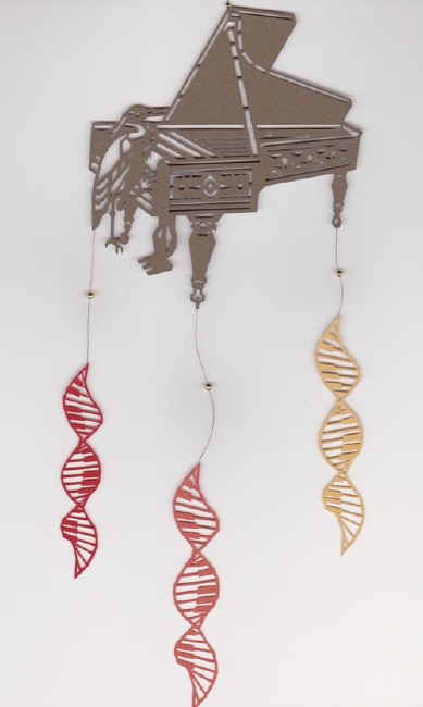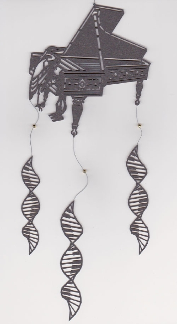 サギがチェンバロのようなピアノを弾いています。その下に、螺旋状にデザインした鍵盤をつなげて モビールにしました。