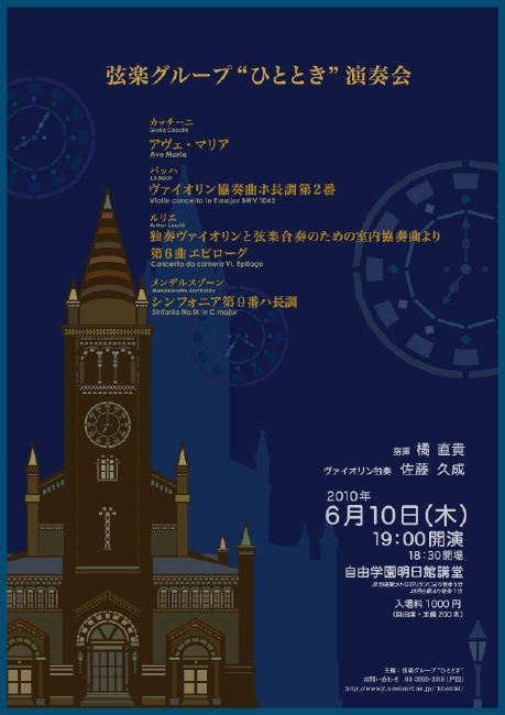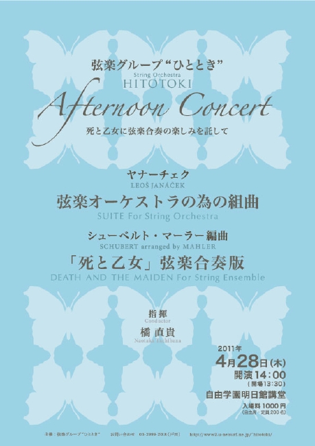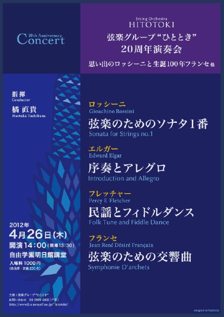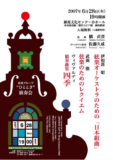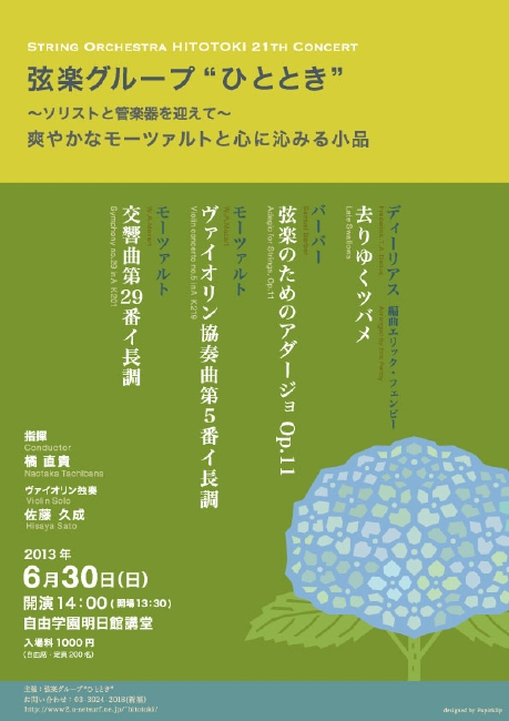 20周年を迎えた弦楽オーケストラ。平均年齢はわりと高めですが、みなさん勉強熱心、やる気は若い人に負けないという自信をもってます。その中で私ももまれ続けて、気がつけばヴィオラ歴もついに20年に。ひととき在籍も数えてみると10年目?!。2007年からは演奏会のちらしのデザインを担当しています。